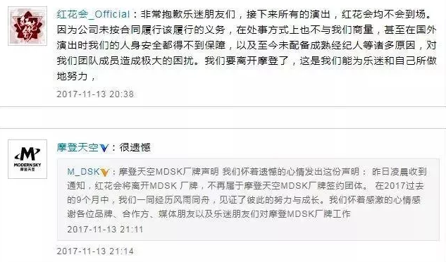 11月13日晚,红花会发表官方声明,宣布退出摩登天空旗下厂牌MDSK,半小时后,MDSK厂牌也通过官微回应确认此事。这次突如其来的“分手”给红花会与摩登天空短短9个月的合约期画下了句点,也掀开了一轮关于嘻哈音乐人从地下说唱团体、到成为主流市场中有能力自立门户的人气团队趋势的后续解读。