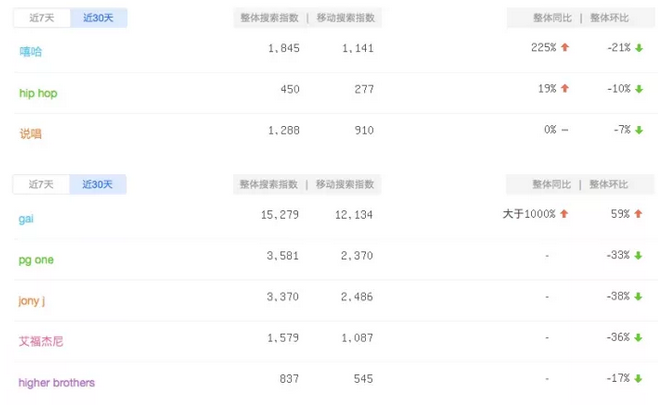 随着节目结束,除了加入刘洲厂牌的场拍,得到专业团队做娱乐化经营的 GAI 之外,其他相关词条的百度指数整体都在下降