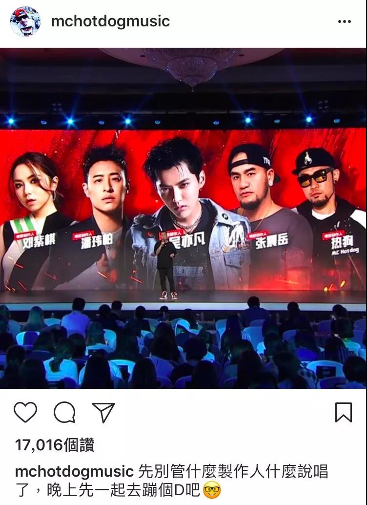 热狗在节目组公布了制作人阵容之后,首先发文:先别管什么制作人什么说唱了,晚上先去蹦个D(迪)吧……