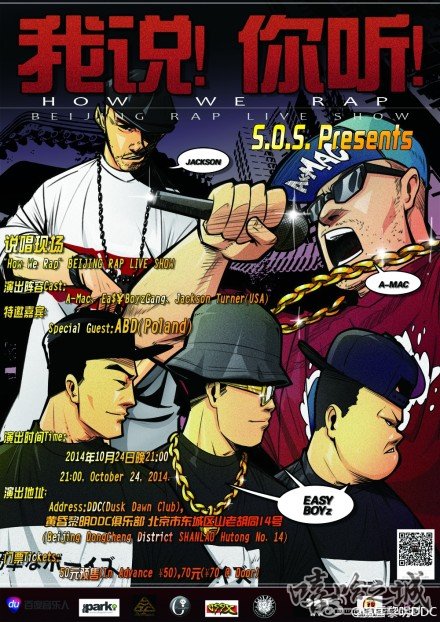 10月24日“我说!你听!”说唱现场.S.O.S.演出厂牌真正的MC们在这晚准备了一场真正的“说唱晚宴”.阵容:A-Mac、EasyBoyzGang(通利福尼亚)、黑杰克(美国)ABD(波兰).门票:70(现场)50(预售).