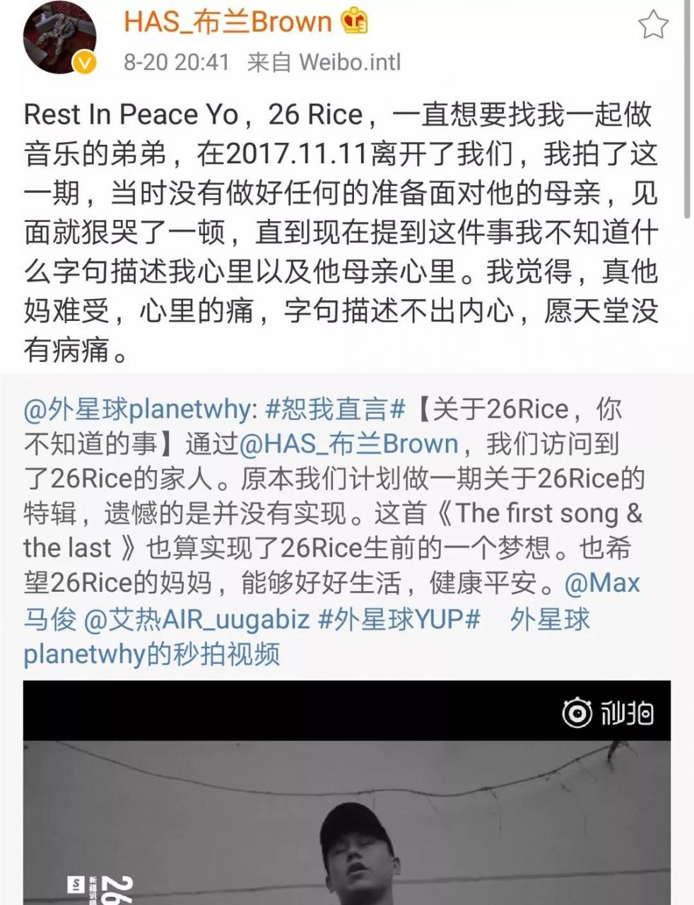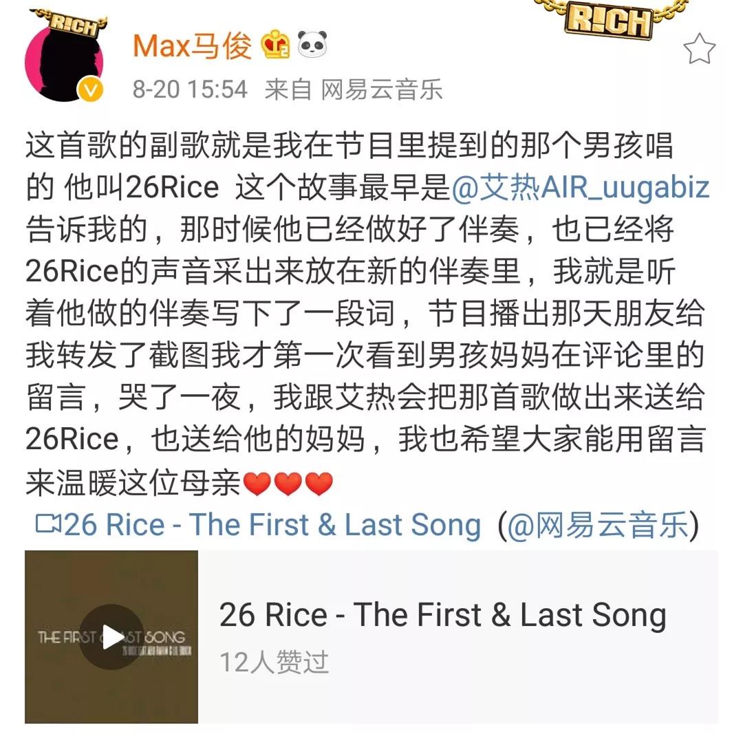 在《中国新说唱》第六期,马俊讲了一个故事,这个故事是艾热告诉他的。关于这个故事背后的故事,可看8月19日我写的马俊所说的因哮喘离世的16岁rapper,叫26 Rice,那篇文章发出后,有位叫田万亩的网友留言说他是《恕我直言》的导演(第5和第6集是他执导的),他说本周放出的《恕我直言》会有26 Rice的部分。