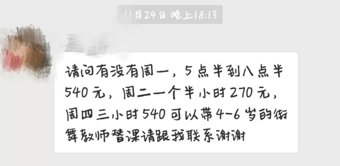 最近朋友生病无法上课,想找人帮忙代课,于是我帮她在“某兼职舞蹈代课群里”发了一条: