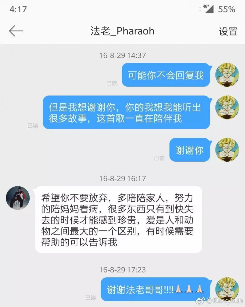 曾经有段时间,身处低谷的法老不知道要不要继续做说唱音乐,在一场演出中,一位乐迷跟法老说:“你的音乐给了我很大的鼓舞。”那一位乐迷就是Buzzy。