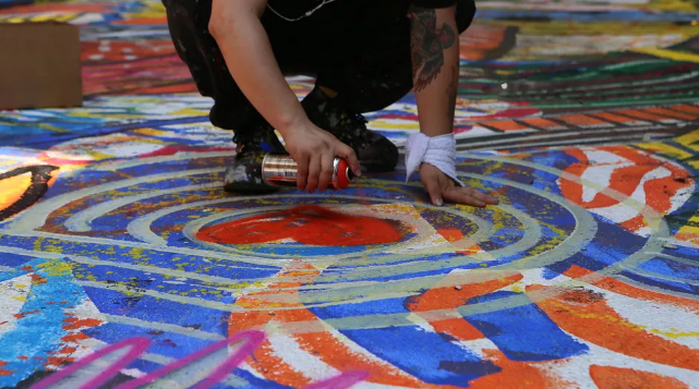 陈栋帆今年在宰也街的地面上画出大型艺术涂鸦,以街头艺术焕新人们对街道的印象,并以龙,花等中国元素活化华埠的风貌。