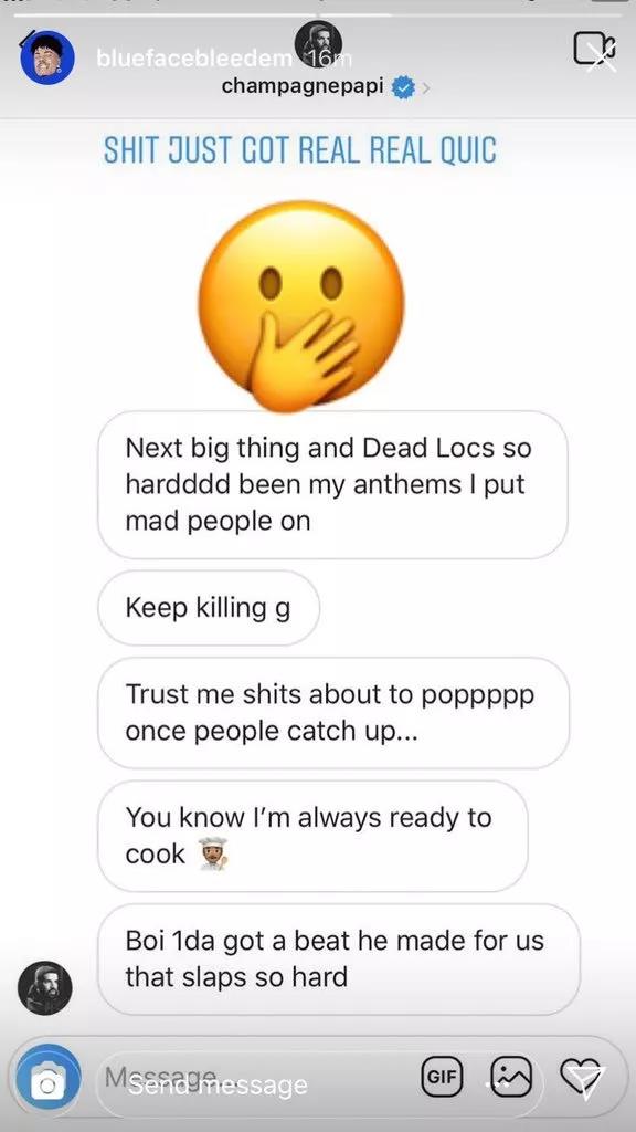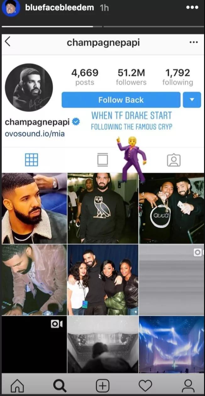 短短一年时间内突然蹿红,也引起了许多圈内人士的关注。连现在已是天王级别的Drake,也在Instagram上关注了Blueface,且主动私聊了对方,邀请他一起合作。