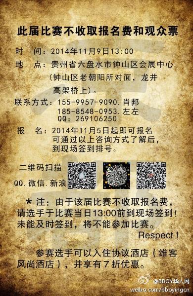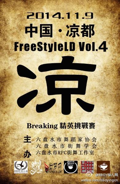 中国·凉都·六盘水·FreeStyleLD Vol.4 大型Breaking街舞精英挑战赛即将拉开帷幕,各位Bboys/Bgirls们备战吧!同时也有幸的请到了来自成都新空间的Bboy Keven&杨凯 老师作为此届比赛的Judge!此届比赛不收取任何报名费观众票,望大家积极参与! 详情建海报!