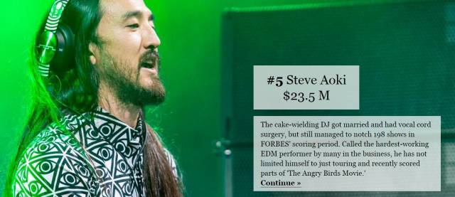 日裔美籍,Steve Aoki排名第五,下降一名,年收入2350万美金。