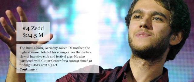 Zedd排名第四紧随其后,年收入为2450万美金。可惜大张伟的粉丝敢大言不惭地发表“Zedd是小明星”“外国音乐现在发展很差Zedd都要饿死了”“勒索大张伟”之类让人笑掉大牙的话。反之,他从第八名升至第四名。其实这次的明显抄袭并不是让国人知道了Zedd,而是让鬼佬知道了大张伟,并且骂到体无完肤。因为电音界本来就每个人都知道Zedd。