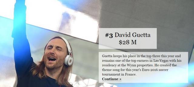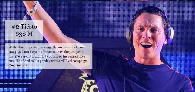 出生于荷兰的Tiesto获得了3800万美金的年收入,其中七喜在过去的一年内总共对Tiesto支出数百万美金。David Guetta则获得2800万美金的年收入,欧洲杯上也让全世界更多人认识到他。两人的排名相比去年调换了位置。