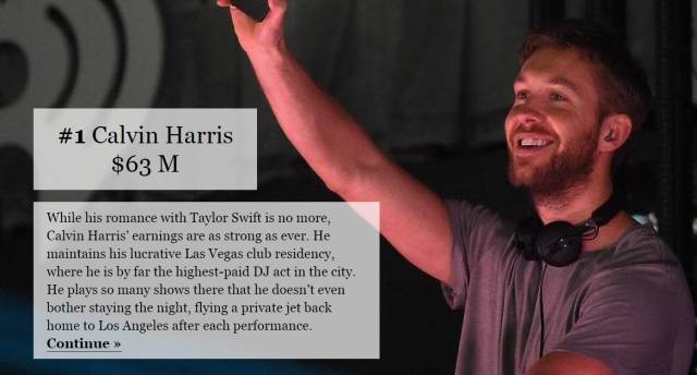 从表面上来看,这是Calvin Harris最艰难的一年。遇到车祸,与女友Taylor Swift分手。虽然同比去年收入下降了300万美金,但仍然以6300万美金的数值成为世界上年收入最高的DJ,保持吸金王这一国际称号。