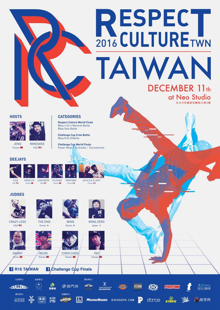 2016 Respect Culture X Challenge Cup World Finals将在12月11日在台北上演年终对决,Bboy 4V4 National Crew Battle、Bboy Solo Battle 及Challenge Cup 8V8 Crew Battle将依次上演,精彩赛事接连上场,2016 Respect Culture x Challenge Cup World Finals将不间断的活让你感受全新的街舞魅力。同时,让我们共同保留“Respect Culture”的信念。