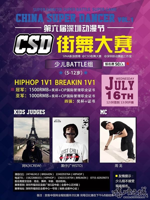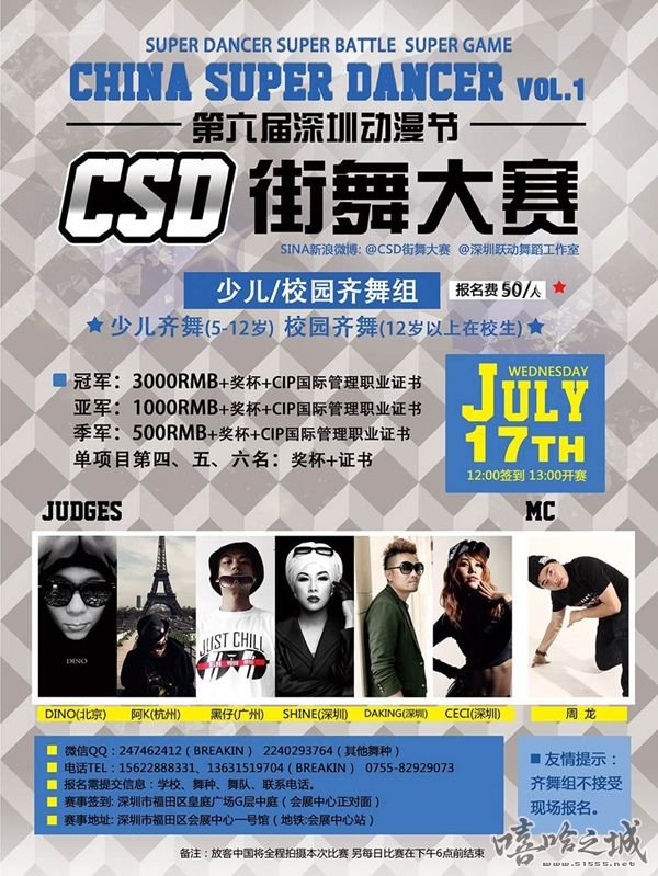 7.19 POPPIN,7.20 HIPHOP&LOCKIN 两日均为12:00签到 13:00海选(皇庭广场)!!16日@X-crew阿K WORKSHOP,18日FrankyDee WORKSHOP, 19日Batalla WORKSHOP, 20日@黄景行SuperDino WORKSHOP~~~HIPHOP JUDGES: Franky Dee & Batalla 一个是和Majid一同捧回今年JusteDebout总冠军,另一个是摘得今年JD瑞典赛区HipHop2V2总冠军~BATTLE GUEST: Atsuki(Loca) from大阪,关注日本赛事的朋友应该不陌生近年来频频杀进Final的这枚狠人2014Dance@Live日本总决赛4强~更多动态请关注微博@CSD街舞大赛!!等你来燥!