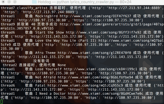 选定虾米音乐之后,写了好一会代码,抓取歌词的爬虫开始蹭蹭工作了⇣