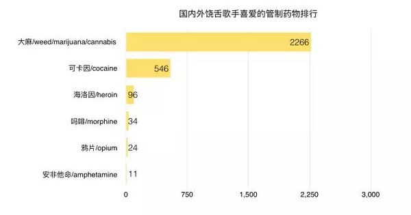 看来饶舌歌手不那么喜欢喝威士忌,排在威士忌前面的还分别有龙舌兰、白兰地、朗姆酒,限于图表大小我没将这几个列入图表。香槟作为富有的象征,遥遥领先,不过国内的饶舌歌手似乎处于消费尚未升级的水平,啤酒排在首位。外国人比较喜欢金酒,国内的饶舌歌手几乎没提到,虽然金酒一般用来调鸡尾酒,但是鸡尾酒提到的次数也是少得可怜。