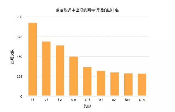 韵脚的分布挺有趣的,我统计了一下出现前十的两字词语韵脚⇣